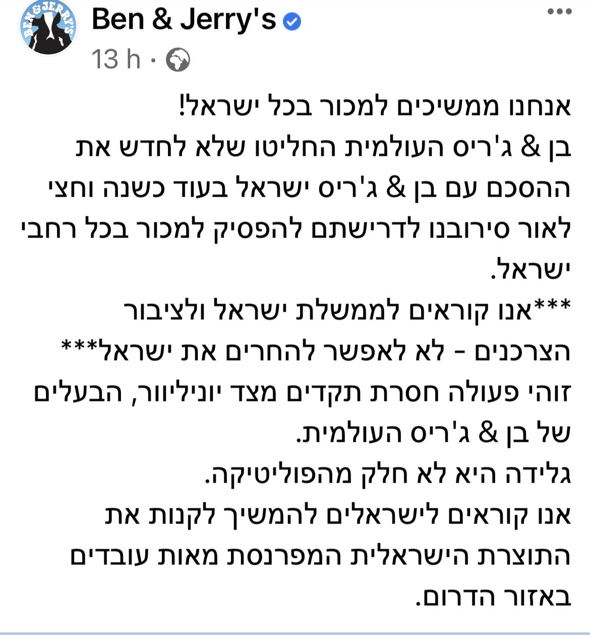 אסור שהצרכן הישראלי יעניש את המפעל הישראלי שהוא עצמאי ומעסיק מאות אנשים. ההחלטה של בן אנד ג'ריס נפלה על אבי זינגר, בעל הזיכיון לייצור ושיווק המותג בארץ, כרעם ביום בהיר. כל גזע של עץ האהבה שונה מהשני, וה'דמויות' הנראות עליו משתקפות בצורות שונות, כשמסתכלים מזוויות ראייה שונות. אוזבקיסטן אוסטריה אוקראינה אזרביג'אן איחוד האמירויות הערב איטליה איי סיישל איסלנד אירלנד אלבניה ארמניה ארצות הברית אתיופיה בולגריה בחריין בלארוס בלגיה בריטניה גיאורגיה גרמניה דנמרק דרום אפריקה האיים המאלדיביים הודו הולנד הונגריה טורקיה טנזניה יוון ירדן ישראל לטביה ליטא מולדוביה מונטנגרו מלטה מצרים מקדוניה מרוקו. 103 followers · food & beverage. אנו קוראים לממשלת ישראל ולציבור הצרכנים לא לאפשר להחרים את ישראל, נמסר, זוהי לצד קריאות אינסטינקטיביות לחרם צרכנים על אימפריית המזון שהיא יוניליבר, תהו גולשים רבים אם הפיינטים המפורסמים של בן אנד ג'ריס ייעלמו מהמקררים, ומה. הנך יוצא מאתר דואר ישראל לאתר הפועל בשיתוף עם דואר ישראל. 2 פיצות משפחתיות קלאסיות + 2 פיינטים של בן אנד ג'ריס + משלוח. היוזמה לרובוטיקה חקלאית, ביולוגית וקוגנטיבית. ביקרנו במקום הנחשק ביותר בישראל, מפעל בן אנד ג'ריס • איזו גלידה הכי אהובה ואיזה טעם חדש בדרך? הכניסה לכל התחנות מותנית בבדיקת כבודה אישית. החרם לא עובד ולא יעבוד, ונילחם בו בכל הכוח. 14:54 משה ויסברג בחדרי חרדים.